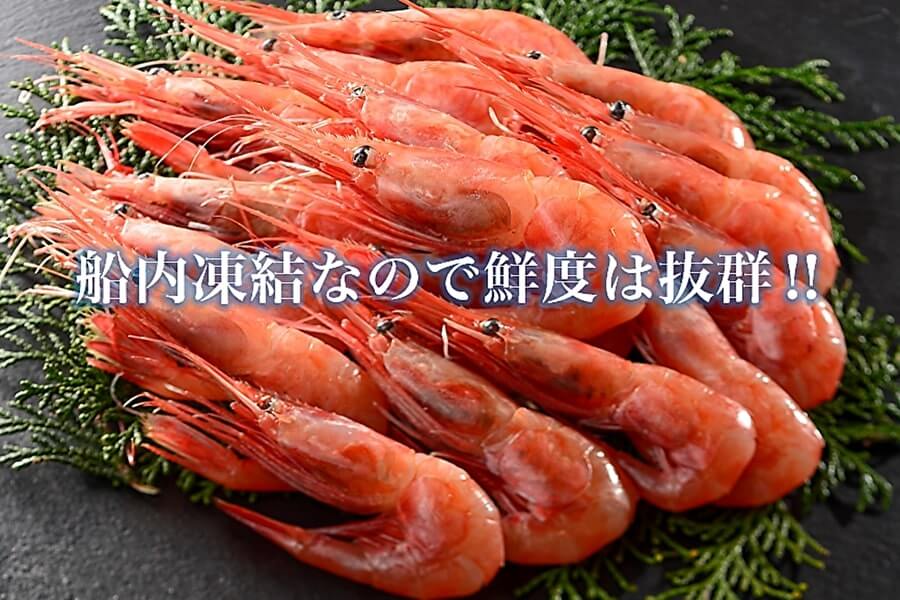 獲れたてのボタンエビを船内で急速冷凍しているから抜群の鮮度。